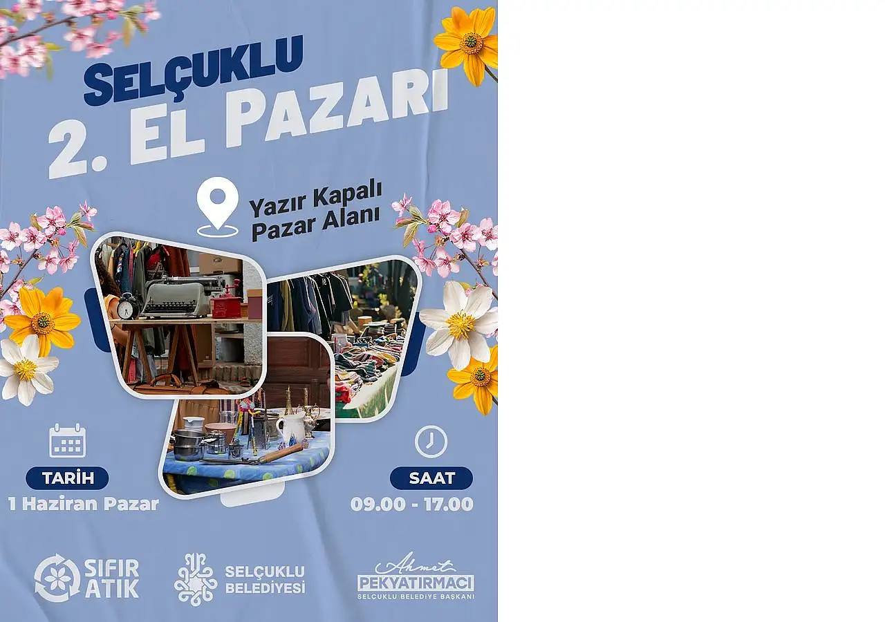 Selçuklu 2. El Pazarı, 1 Haziran Pazar günü Yazır Kapalı Pazar alanında sizleri bekliyor.