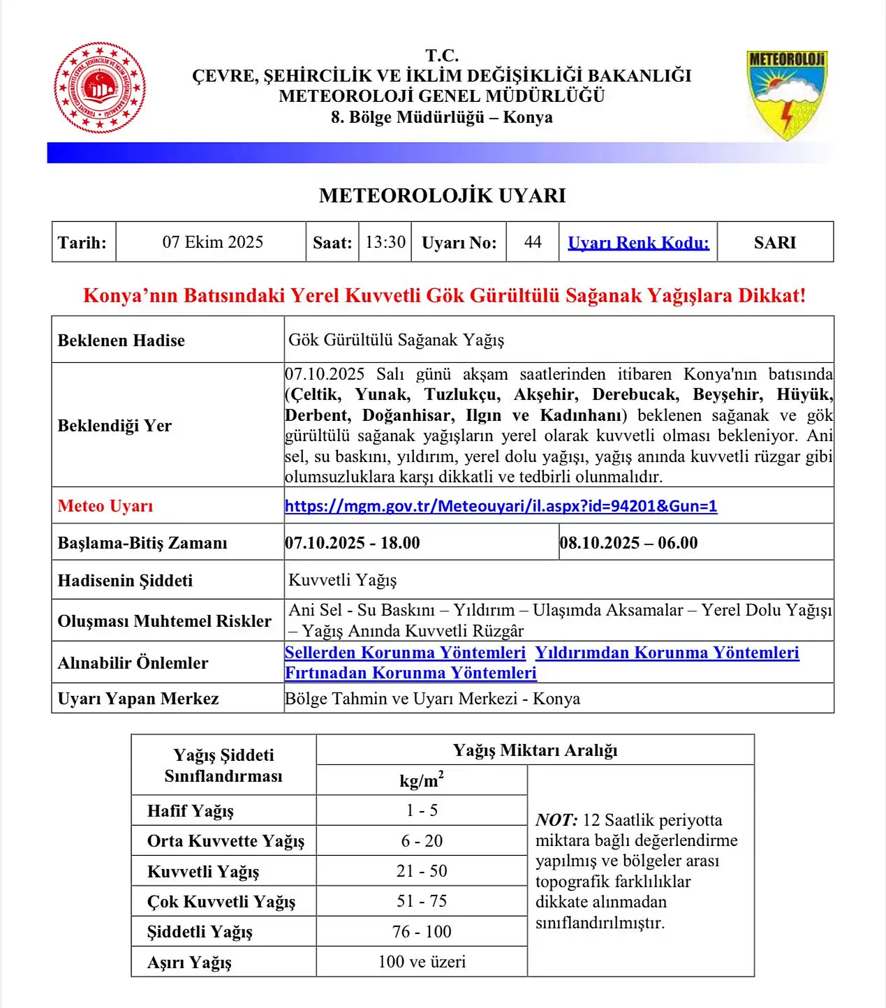 07.10.2025 Salı günü akşam saatlerinden itibaren Konya'nın batısında (Çeltik, Yunak, Tuzlukçu, Akşehir, Derebucak, Beyşehir, Hüyük, Derbent, Doğanhisar, Ilgın ve Kadınhanı) beklenen sağanak ve gök gürültülü sağanak yağışların yerel olarak kuvvetli olması bekleniyor.