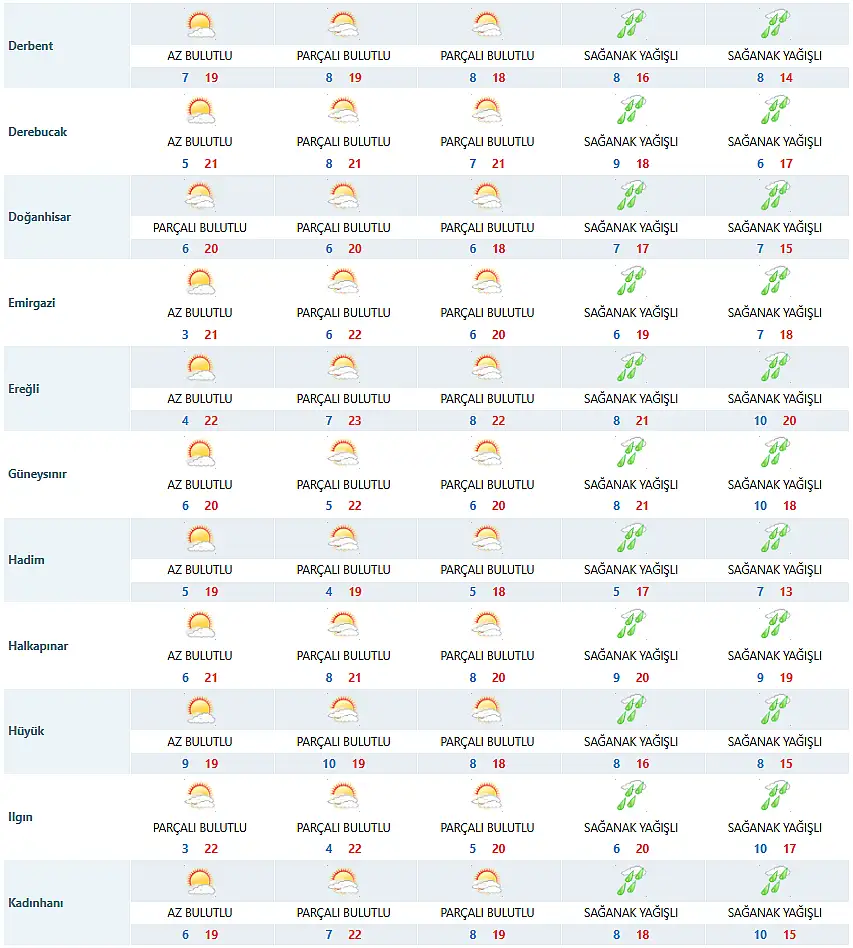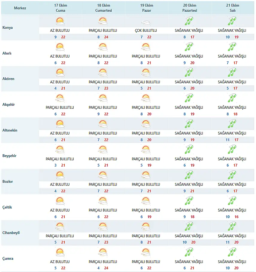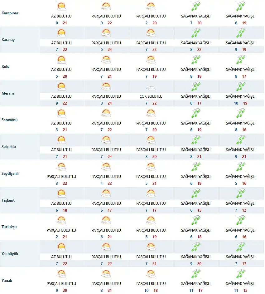 Meteoroloji 8. Bölge Müdürlüğü, tarafından yapılan son tahmine göre Konya merkez ve ilçelerinde en düşük ve en yüksek sıcaklık dereceleri ise şöyle olacak:
