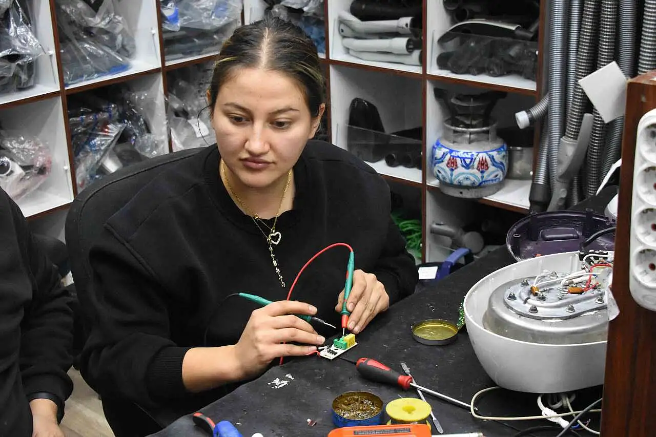''Babamı çok seviyoruz. O yüzden çocukken de dükkana çok giderdik. Bazı günlerde, babam dükkana götürmez korkusuyla erkenden uyanıp, kapıda babamın işe gitmesini bekliyordum ve onunla birlikte dükkana geliyordum. Dükkan, yabancı olduğum bir yer değildi. Ben çok küçükken sokakta oyun oynarken bile ip atlardık. İp atlamak için de bize süpürge kablosu getirirdi. Bebekleri parçalıyorduk. Babam da baktı bunlar her şeyi parçalıyor, bozuk olan süpürge başlığı, hurda ütüleri getiriyordu. Biz de onlarla oynuyorduk, parçalayıp, birleştirmeye çalışıyorduk. Ben dükkanda ilk çalışmaya başladığım zaman, ‘Kız çalışır mı', 'Sen ne anlarsın’ gibi tepkilerle çok karşılaştık. Müşterinin ürününü yapıp verirdik, ‘Helal olsun’ derlerdi. Ama bunu yapabilmemiz temelde bir 5 yılı bulmuştur. Baktılar kızlar da bu işi yapabiliyor, ondan sonra alıştılar. Bu sektörde 15 yılım geçti ve beni görünce artık şaşırmıyorlar.''