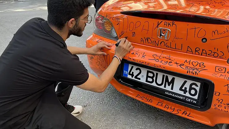 Konya'da yaşayan 25 yaşındaki esnaf Muhammet Çetin, otomobiline kendi çevresiyle birlikte imza atmaya başladı.Çetin'in iş yerinin karşısında duran turuncu renk kaplamalı Honda S2000 Cabrio otomobili ilgi odağı olurken, görenler araca imza atmadan geçmiyor