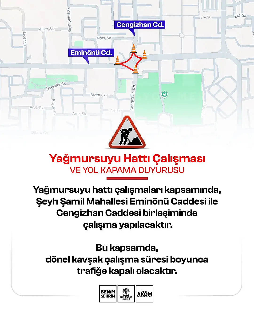 Yağmursuyu hattı çalışmaları kapsamında, 5 Kasım Çarşamba günü saat 8.00 itibarıyla başlayacak olan çalışma, Şeyh Şamil Mahallesi Eminönü Caddesi ile Cengizhan Caddesi birleşiminde gerçekleştirilecektir. Bu kapsamda, dönel kavşak çalışma süresi boyunca trafiğe kapalı olacak olup, çalışmaların 6 Kasım Perşembe günü saat 20.00 itibarıyla tamamlanması planlanmaktadır.