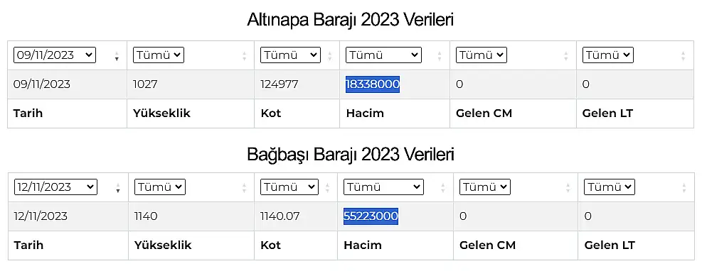 2023 yılı Kasım ayı baraj doluluk oranlarına baktığımızda Altınapa Barajı geçen yıl 18 milyon 338 bin metreküp suya sahipken 2024 yılında bu oran 5 milyon 287 bin metreküpe geriledi. Arada kaybolan 13 milyon 0,51 bin metreküp değer, yaşanan su krizinin önemini gözler önüne seriyor. Hadim’de yer alan Bağbaşı Barajı’nda ise geçtiğimiz yılın Kasım ayı ölçülen verilerde su hacmi 55 milyon 223 bin metreküp iken bu yıl 38 milyon 489 bin metreküpe çekildi.