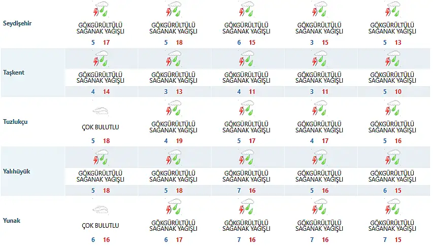 Meteoroloji 8. Bölge Müdürlüğü, tarafından yapılan son tahmine göre Konya merkez ve ilçelerinde en düşük ve en yüksek sıcaklık dereceleri ise şöyle olacak: