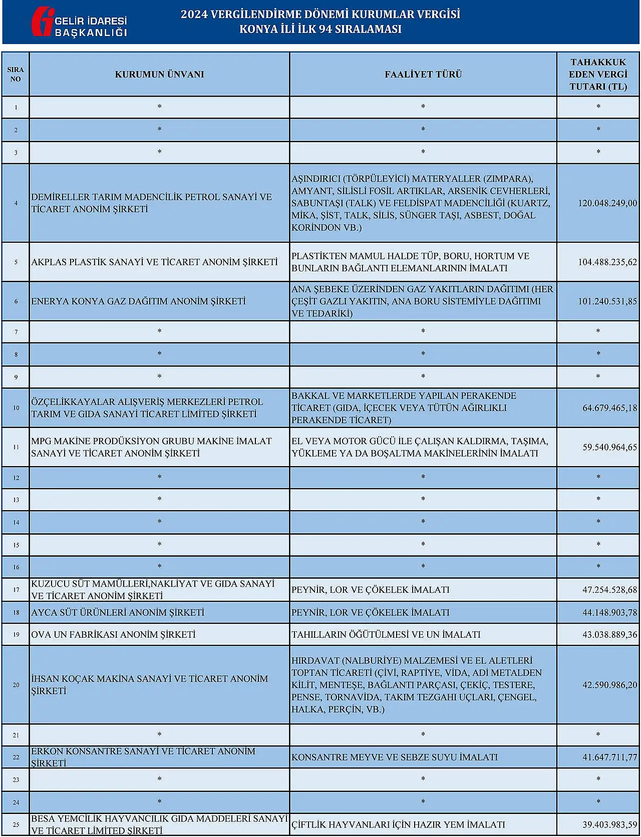 Konya Vergi Dairesi Başkanlığı, 2024 yılı kurumlar vergisi rekortmenleri listesini kamuoyuyla paylaştı.Her yıl olduğu gibi bu yıl da kentin en çok vergi ödeyen şirketleri belli olurken, listenin zirvesindeki isimler bu kez gizemini korudu.