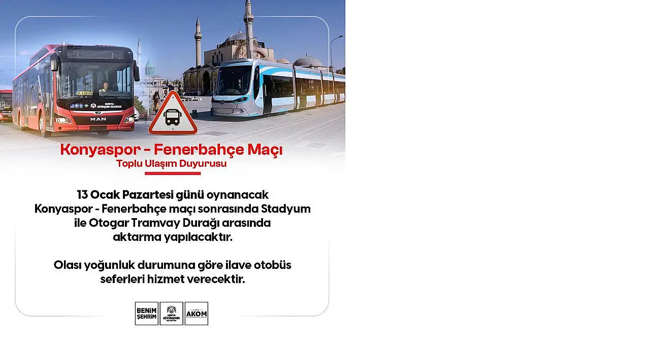 "Toplu Ulaşım Duyurusu13 Ocak Pazartesi günü oynanacak Konyaspor - Fenerbahce maçı sonrasında Stadyum ile Otogar Tramvay Durağı arasında transfer edilecektir.