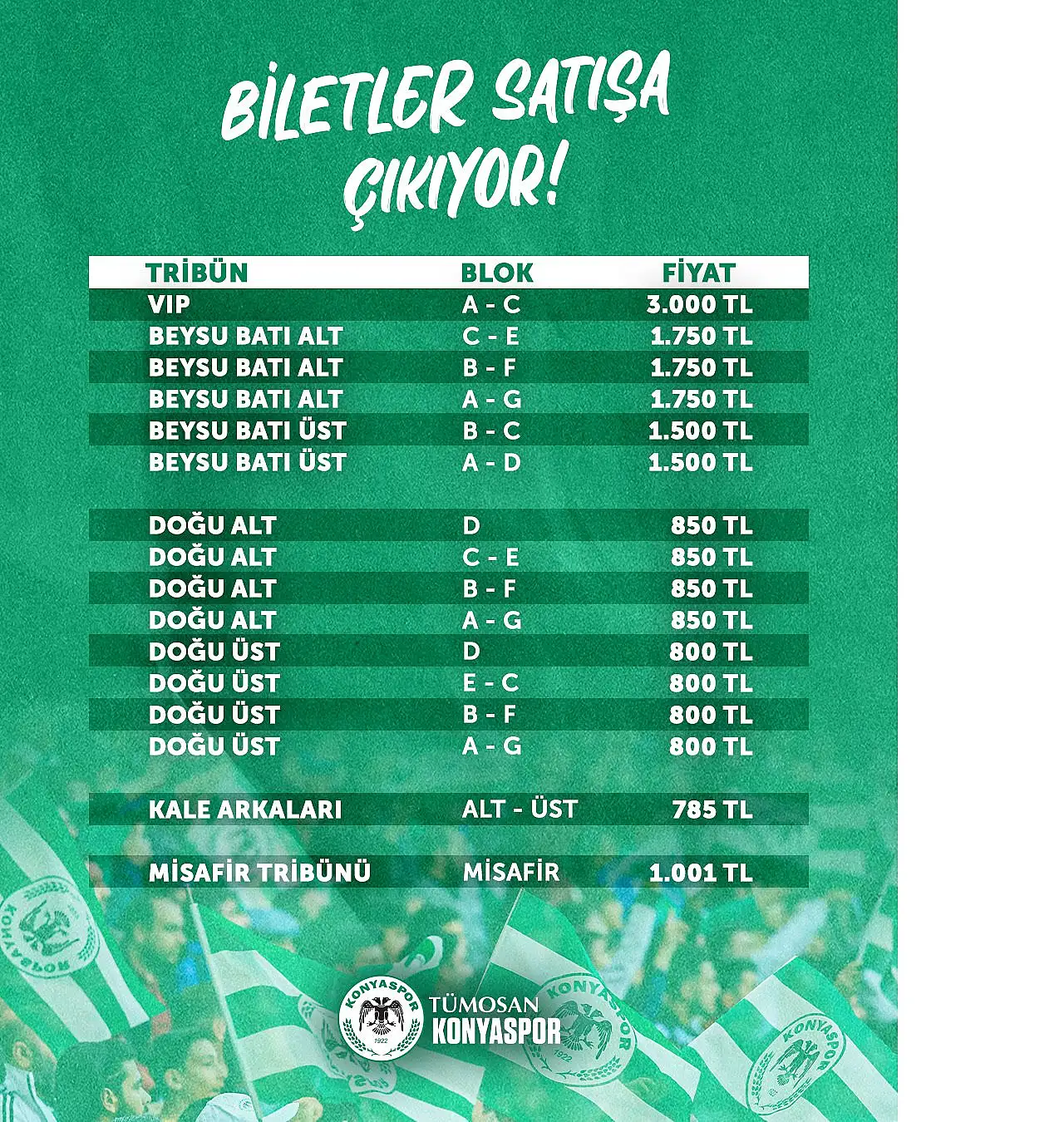 6 Mayıs Pazartesi günü saat 20.00’de MEDAŞ Konya Büyükşehir Stadyumu'nda oynanacak maçın biletleri satışa çıkıyor. Karşılaşmanın biletleri, 1 Mayıs Çarşamba günü (yarın) saat 11.00 itibarıyla satışa sunulacak.
