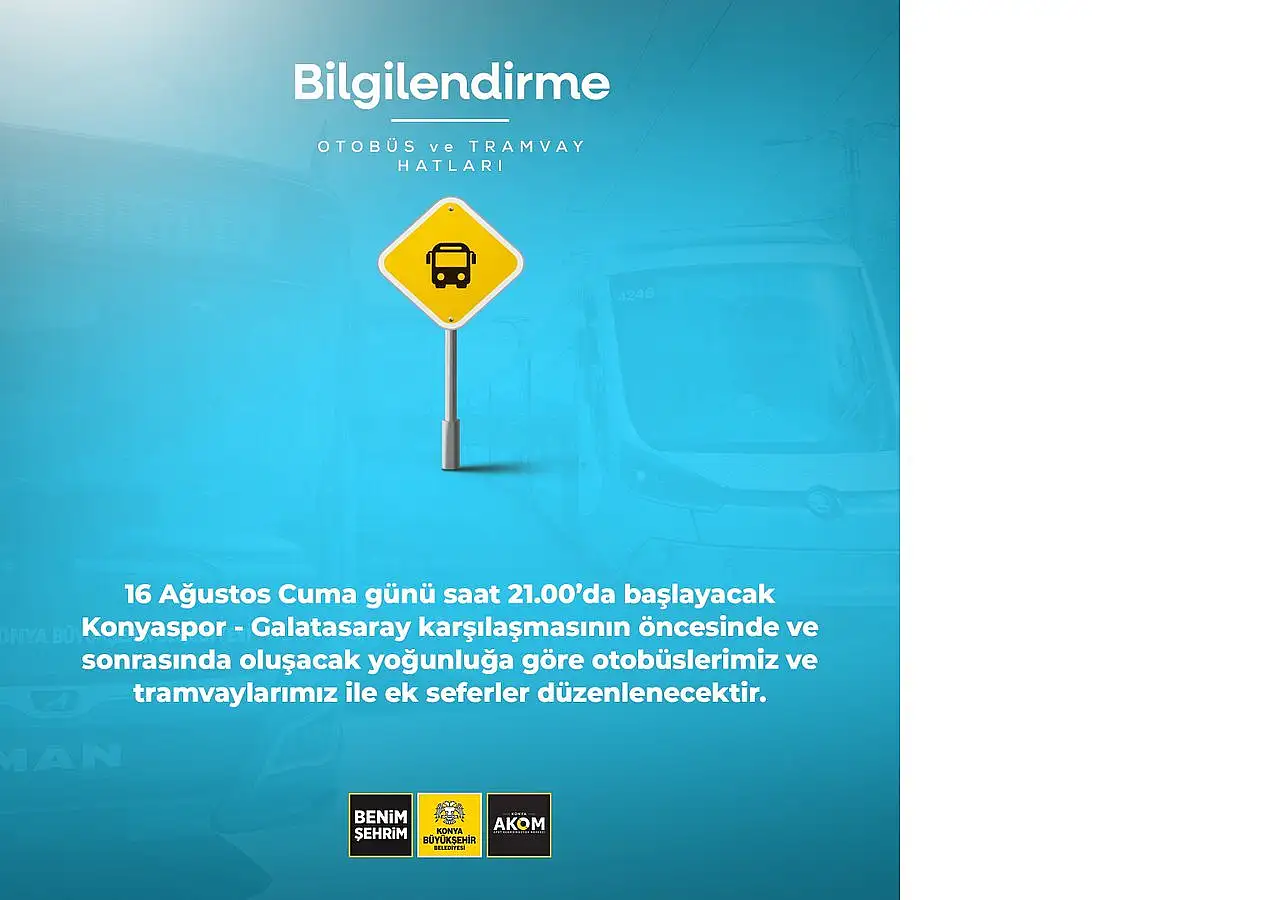 Yarın saat 21.00'da Konya Büyükşehir Stadyumu’nda oynanacak Konyaspor- Galatasaray mücadelesi öncesinde Konya Büyükşehir Belediyesi Afet Koordinasyon Merkezi sosyal medya hesabından Konyaspor - Galatasaray maçı öncesi ve sonrasında oluşacak yoğunluk sebebiyle taraftarların etkilenmesi adına, Otogar Tramvay Durağı ile Stadyum Tramvay Durağı arasında otobüsler ile aktarma yapılacak