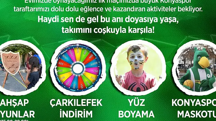Konya Store'dan yapılan açıklamada; "Evimizde oynayacağımız ilk maçımızda büyük Konyaspor taraftarımızı dolu dolu eğlence ve kazandıran aktiviteler bekliyor. Haydi sende gel bu anı doyasıya yaşa, takımını coşkuyla karşıla" denildi.