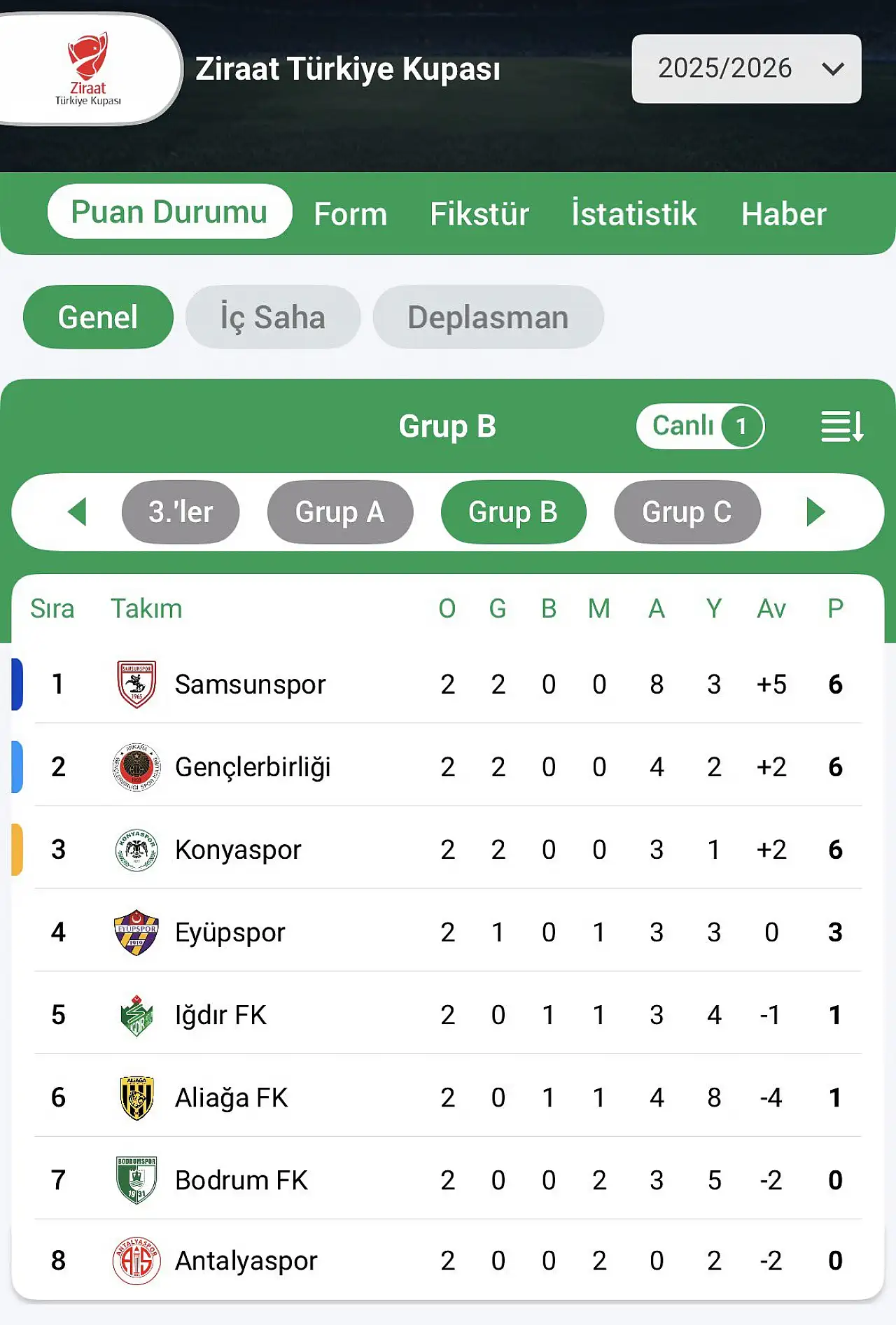 Diğer iki Süper Lig ekibi, Samsunspor ve Gençlerbirliği de aynı Konyaspor iki gruptaki ilk iki maçlarını kazandı 6 puanda yer alıyor. Averajla Karadeniz ekibi ilk sırada, başkent temsilcisi ikinci sırada bulunuyor.