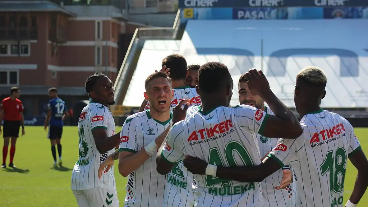 Konyaspor 4.dakikada gole yaklaştı. Pedrihno’nun kullandığı kornerde Uğurcan’ın kafa vuruşu kaleci Gianiotis’te kaldı. Konyaspor, 22.dakikada öne geçti. Ndao’nun pasında savunma arkasında ceza sahası içinde topla buluşan Umut topla çizgiye indi. Umut, müsait durumdaki Muleka’ya bıraktı, Muleka Konyaspor formasıyla ilk golünü attı. 37’da Muleka’nın ceza sahası dışından vuruşunu kaleci kontrol etti. Konyaspor, ilk yarıyı 1-0 önde bitirdi.