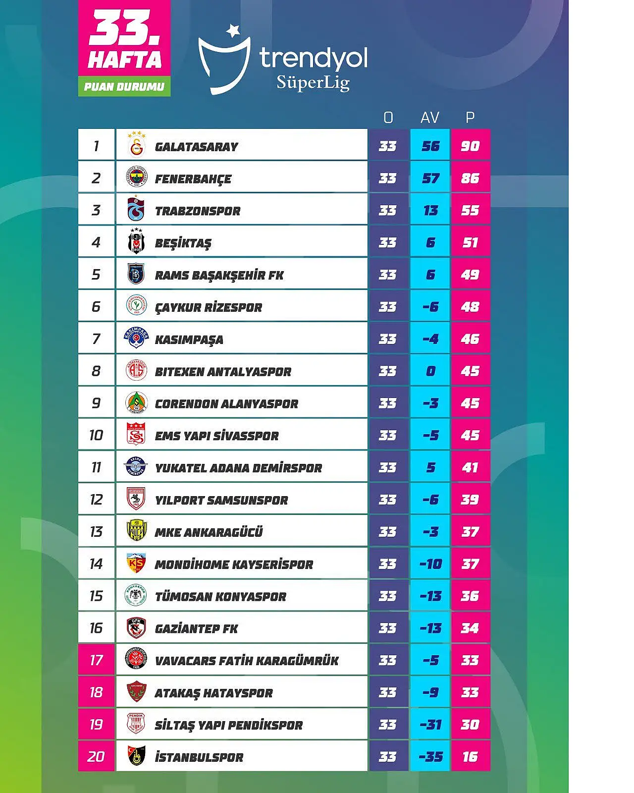 Trendyol Süper Lig'de 33.hafta sona erdi.