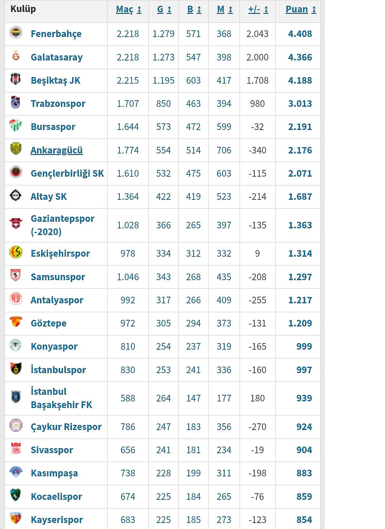 Anadolu Kartalı, şu ana kadar lig tarihinde 810 maça çıkarak, 254 galibiyet, 237 beraberlik ve 317 yenilgiyle 999 puan topladı.