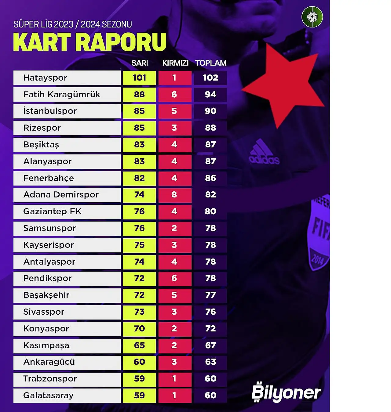 Geride kalan 36 haftada Hatayspor gördüğü 101 sarı be 1 kırmızı kartla toplam 102 kartla ilk sırada yer aldı. Lider Galatasaray ise 59 sarı ve 1 kırmızı kart görerek 50 kartla ligin em az kart gören ekibi olarak dikkat çekiyor.