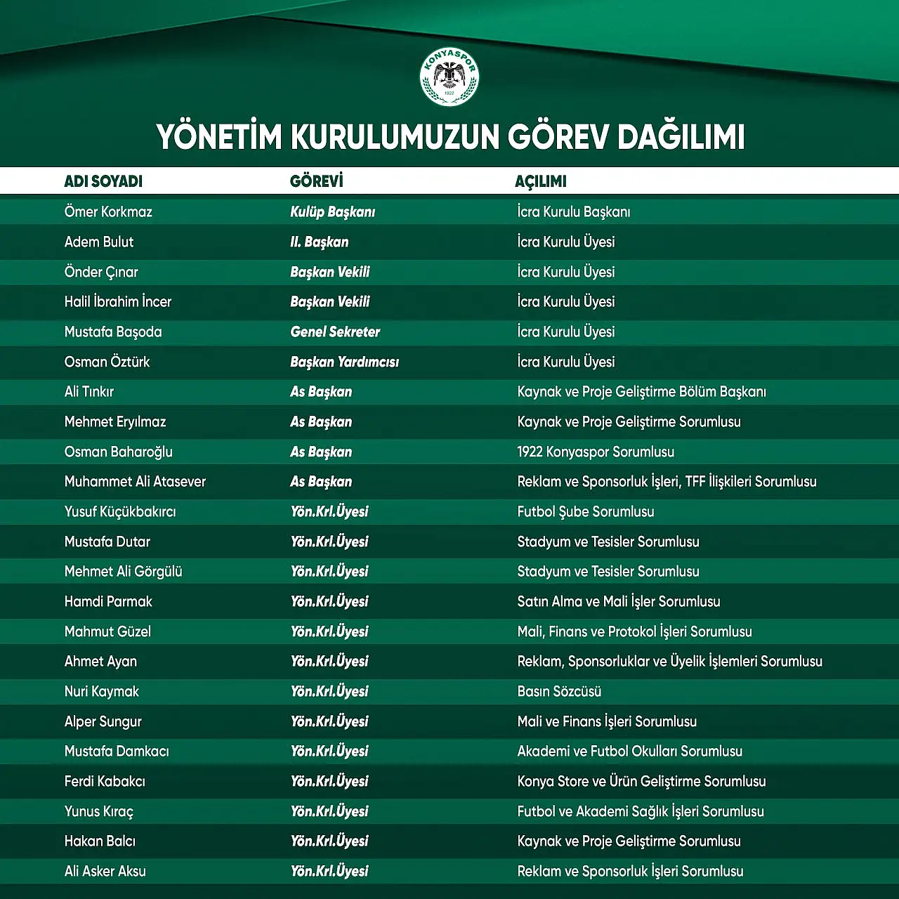 Konyaspor'da 15 Ocak 2025 tarihinde yapılan Olağanüstü Genel Kurul'un ardından göreve yeniden seçilen Ömer Korkmaz Başkanlığı'ndaki Yönetim Kurulu'nun görev dağılımı belli oldu.Adem Bulut, Öner Çınar, Halil İbrahim İncer, Mustafa Başoda ve Osman Öztürk'ün