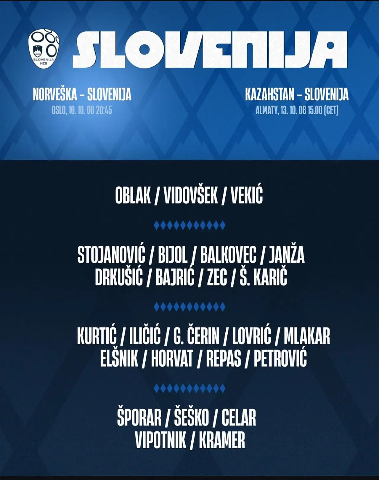 Slovenya, UEFA Uluslar B Ligi 3.Grup'ta 10 Ekim'de Norveç ve 13 Ekim'de Kazakistan ile karşı karşıya gelecek.