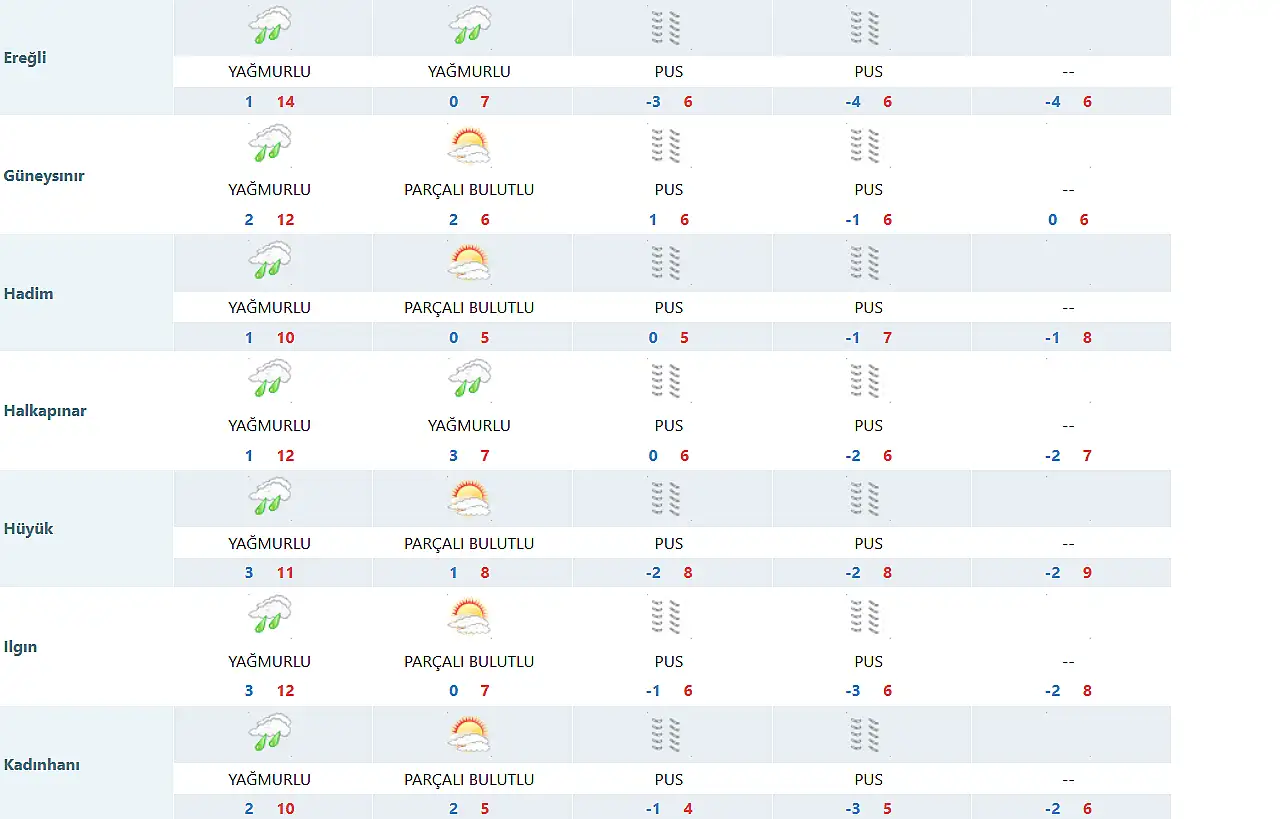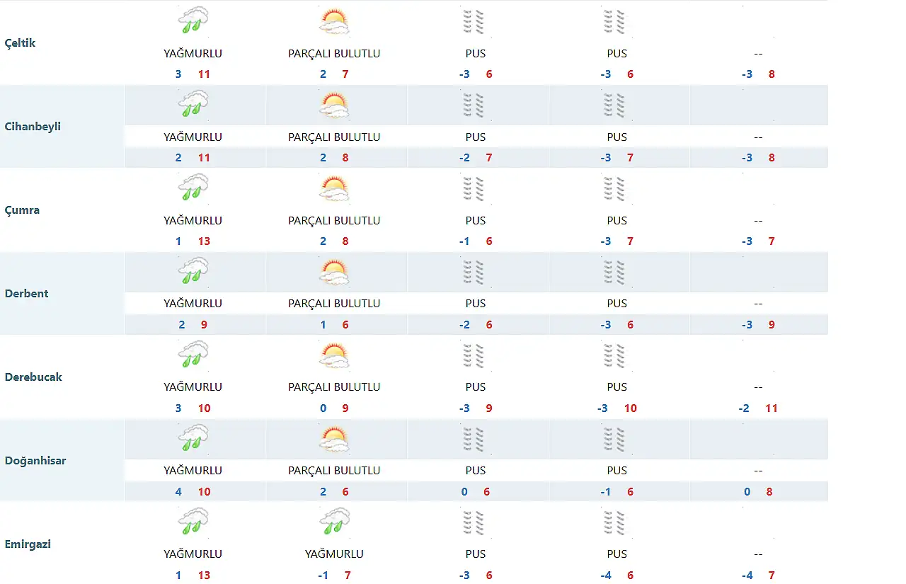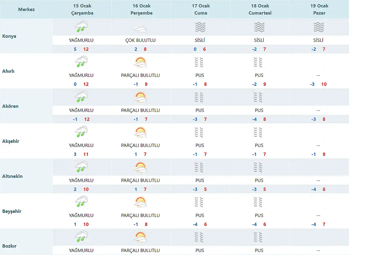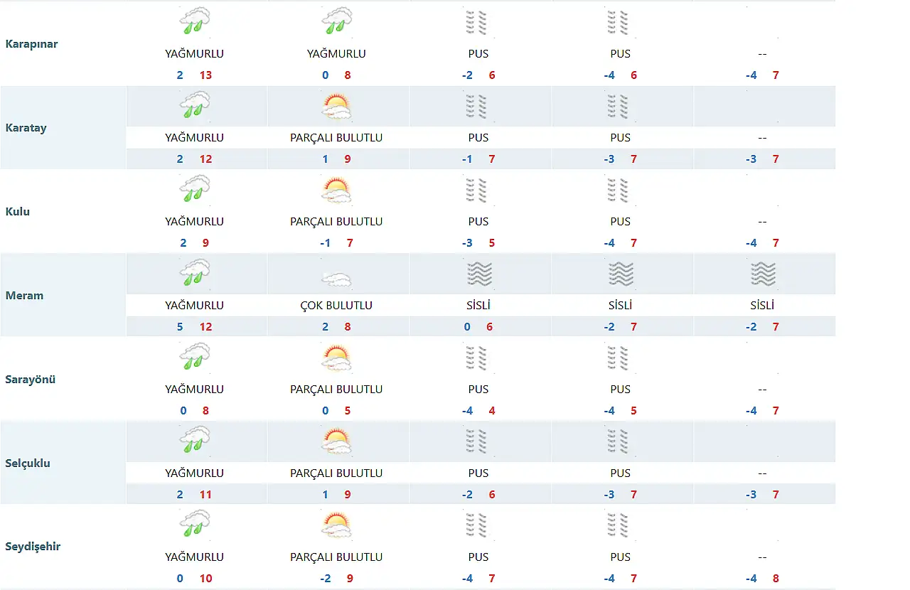 Meteoroloji 8. Bölge Müdürlüğü, tarafından yapılan son tahmine göre Konya'nın merkezinde en düşük ve en yüksek sıcaklık dereceleri ise şöyle olacak: