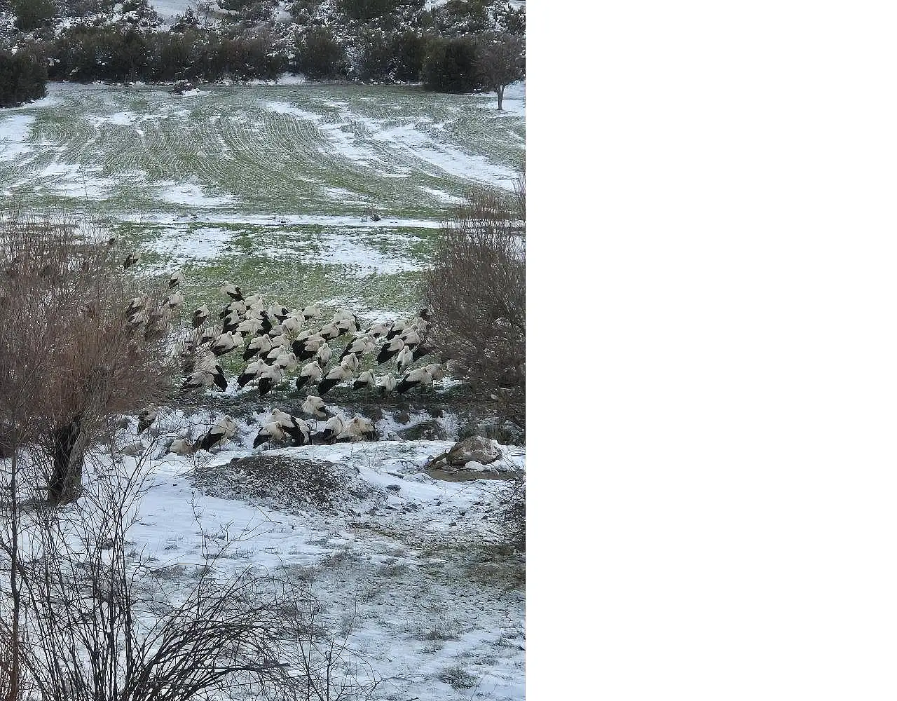 Güzergahları üzerinde yağan kar nedeniyle yiyecek sıkıntısı çeken göç yolundaki leylek sürüleri, Beyşehir ilçe merkezinde iniş yaptıkları alanlarda beslenmeye çalışırken görüldü.Evsel atıklarının taşındığı Şamlar Mahallesi yolu üzerindeki çöp toplama merk
