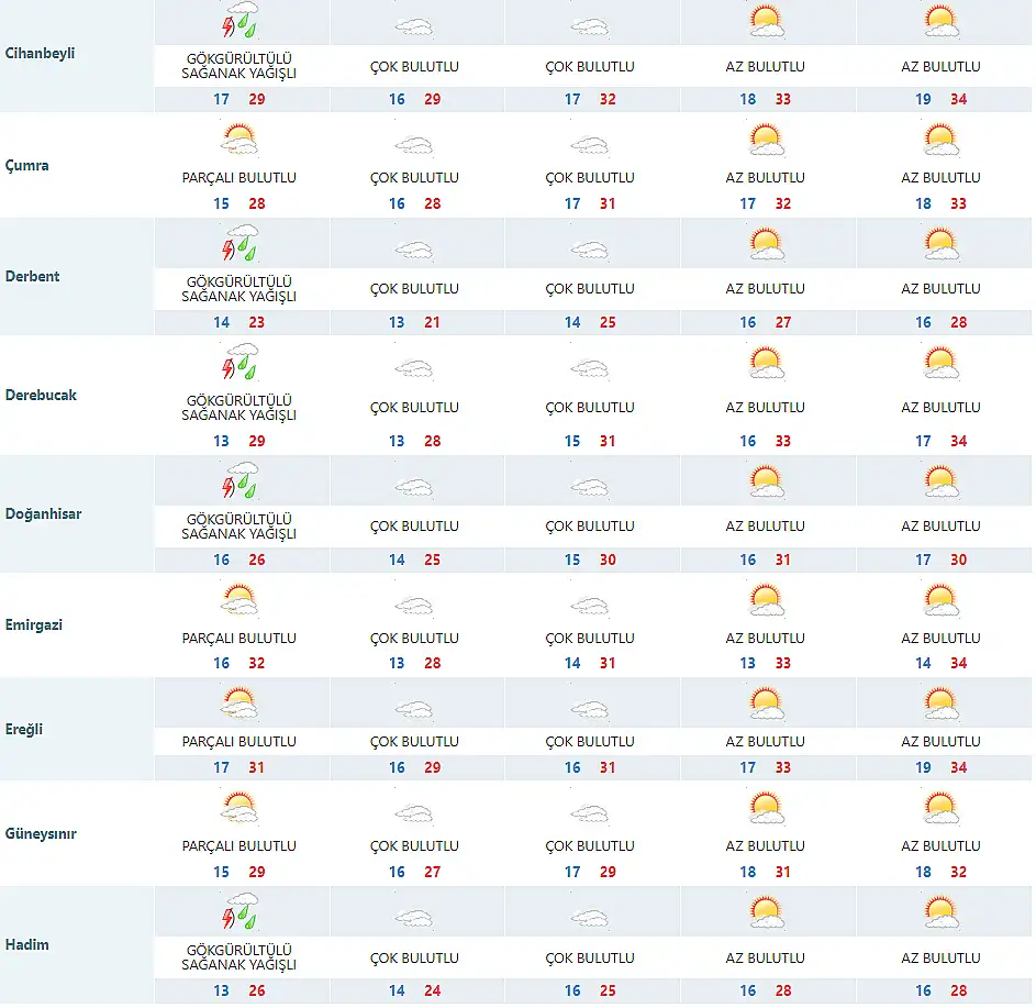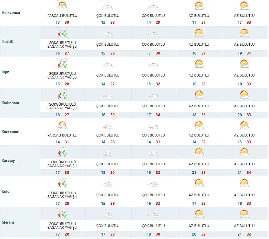 Meteoroloji 8. Bölge Müdürlüğü, tarafından yapılan son tahmine göre Konya'da en düşük ve en yüksek sıcaklık dereceleri ise şöyle olacak: