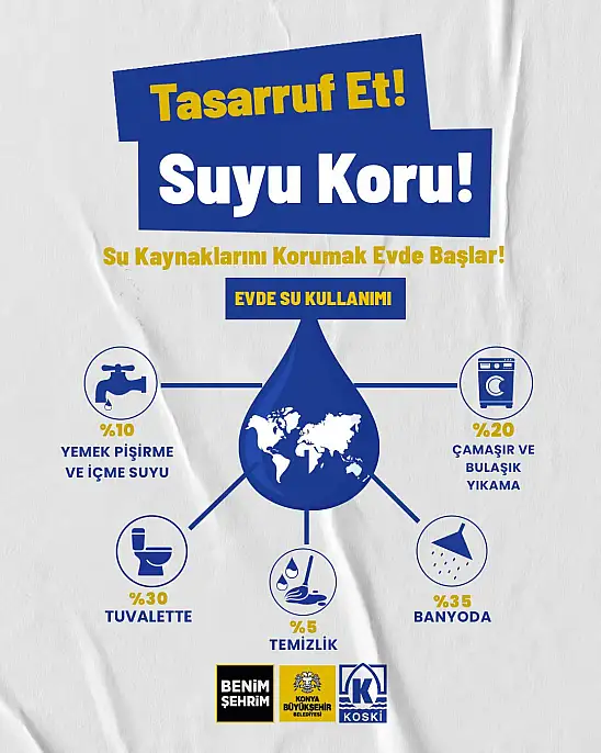 “Su kaynaklarımızı korumaya evimizden, en küçük alışkanlıklarımızdan başlayabiliriz. Peki, evimizde suyu en çok nerelerde tüketiyoruz? %35 Banyo ve %30 Tuvalet: Evde kullanılan suyun yaklaşık %65’i bu alanlarda harcanıyor! Duş süresini sadece 1 dakika kısaltmak bile tonlarca suyu kurtarabilir. %20 Çamaşır ve Bulaşık: Makineleri tam doldurmadan çalıştırmayarak büyük bir israfın önüne geçebiliriz. Konya’mızın ve dünyamızın su geleceği için her damlanın değerini bilelim. Tasarruf etmek yarınlarımızı da korur.”