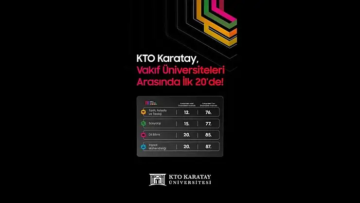 Uluslararası yükseköğretim derecelendirme kuruluşu Times Higher Education tarafından hazırlanan, küresel ölçekte akademisyenler, öğrenciler, üniversiteler ve iş dünyası tarafından dikkate alınan en kapsamlı analizlerden biri olan Times Higher Education (THE) Dünya Üniversite Sıralaması’nın (WUR) 2025 yılı sonuçları açıklandı. KTO Karatay Üniversitesi, dünya listelerinde Türkiye genelinde vakıf üniversiteleri arasında 30. sırada yer aldı. Dünyanın en etkili üniversitelerinin sıralandığı raporda KTO Karatay Üniversitesi, Türkiye’deki vakıf üniversiteleri arasında “Tarih, Felsefe ve Teoloji” sıralamasında 12., “Sosyoloji” kategorisinde 15., “İnşaat Mühendisliği” kategorisinde 20., “Dil Bilimi” kategorisinde 20. sırada ve “Araştırma Kalitesi ve Uluslararası Görünüm” kategorilerinde ise 30. sırada yer alarak en iyi üniversiteler arasında gösterildi.