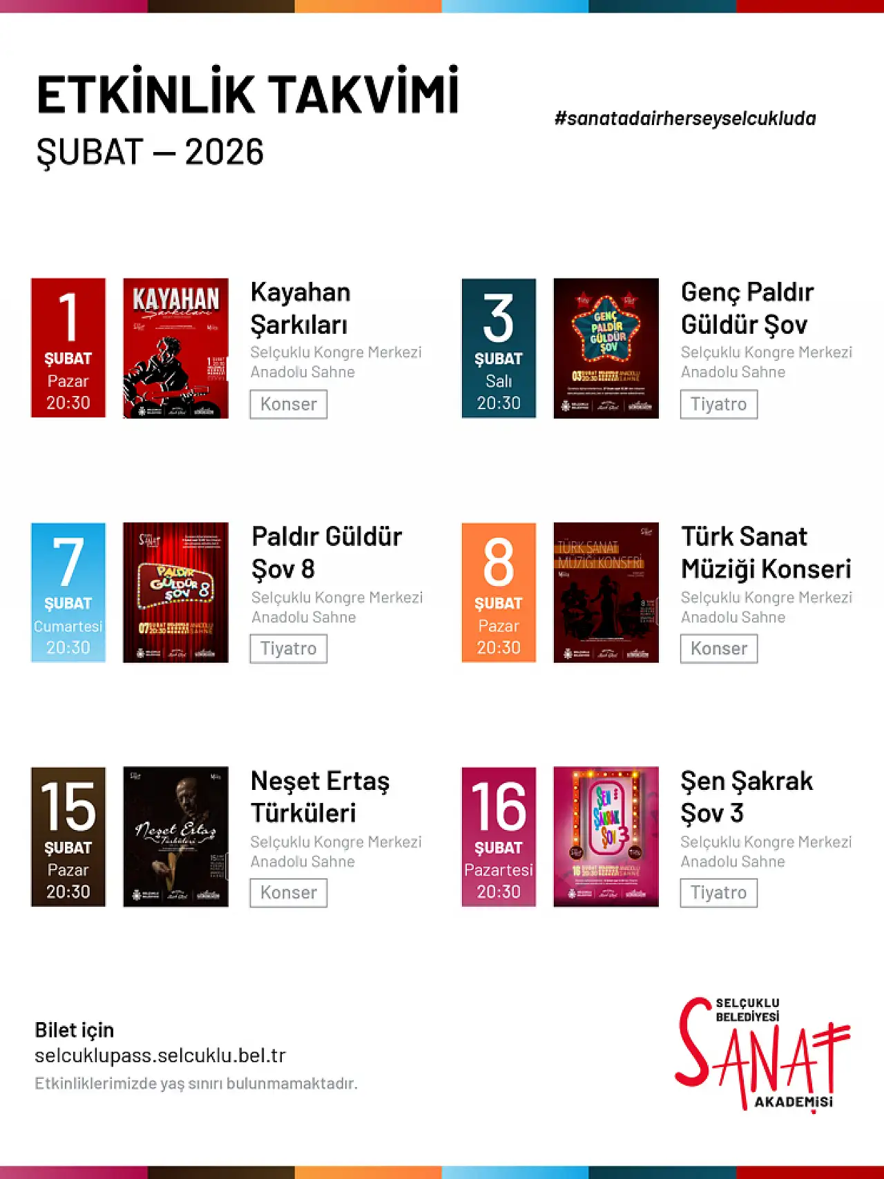 Şubat ayında düzenlenecek etkinlikler kapsamında; 1 Şubat’ta “Kayahan Şarkıları”, 3 Şubat’ta “Genç Paldır Güldür Şov”, 7 Şubat’ta “Paldır Güldür Şov 8”, 8 Şubat’ta “Türk Sanat Müziği Konseri”, 15 Şubatta “Neşet Ertaş Türküleri “, 16 Şubat’ta ise “Şen Şakrak Şov 3” adlı tiyatro oyunu sanatseverlerle buluşacak. Tüm etkinliklerin biletleri belirtilen tarihlerde Selçuklu PASS web sitesi üzerinden ücretsiz olarak temin edilebilecek.