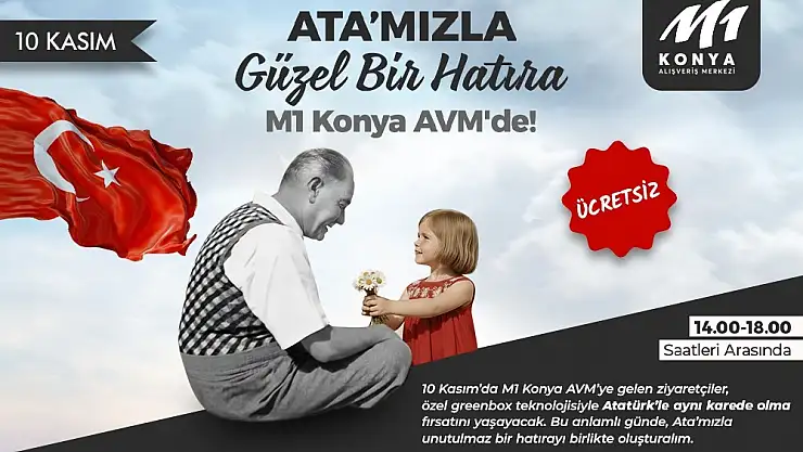 Fiba Commercial Properties tarafından yönetilen M1 Konya AVM, 10 Kasım Atatürk’ü Anma Günü’nde ziyaretçilerine duygusal bir deneyim yaşatmaya hazırlanıyor. Ziyaretçiler, özel olarak kurulacak greenbox fotoğraf alanında dijital teknoloji sayesinde Atatürk ile aynı karede olma fırsatını yakalayacak.
