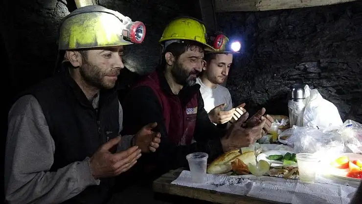 Ailelerinden uzak ilk sahurlarını yerin 200 metre altında yapan işçiler, ezan vaktinin gelmesiyle oruca niyetlenerek dua etti.