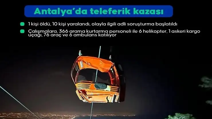 "Antalya'nın Konyaaltı ilçesinde bir teleferik kabininin düşmesi sonucunda bir kişi hayatını kaybetmiş, 10 kişi yaralanmıştır. Kaza sebebiyle 6 ambulans ve 2 UMKE timiyle, toplam 24 kişilik sağlık ekibi görevlendirilmiştir. Yaralılar ilk müdahalelerin ardından hastanelere sevk edilerek tedavilerine başlanmıştır, sağlık durumları ciddiyet arz etmemekte."