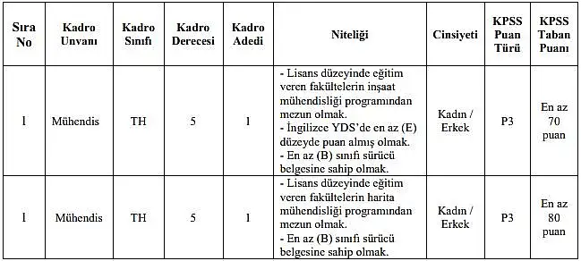 Konya Meram Belediye Başkanlığı, 5393 sayılı Belediye Kanunu çerçevesinde tam zamanlı sözleşmeli personel alımı yapacağını duyurdu. İlanda iki farklı pozisyonda Mühendis alımı yapılacağı belirtildi. İlk pozisyon için lisans düzeyinde eğitim veren fakültelerin İnşaat Mühendisliği programından mezun olma, İngilizce YDS'den en az (E) düzeyinde puan alma ve en az (B) sınıfı sürücü belgesine sahip olma şartları aranıyor. Bu kadro için KPSS P3 taban puanı en az 70 puan olarak belirlendi. İkinci pozisyon ise lisans düzeyinde Harita Mühendisliği mezunlarını kapsıyor ve bu adaylardan en az (B) sınıfı sürücü belgesi isteniyor. Harita Mühendisliği kadrosu için KPSS P3 taban puanı ise en az 80 puan olarak ilan edildi. Her iki pozisyon için de birer (1) kişi alımı yapılacak ve cinsiyet şartı aranmıyor.