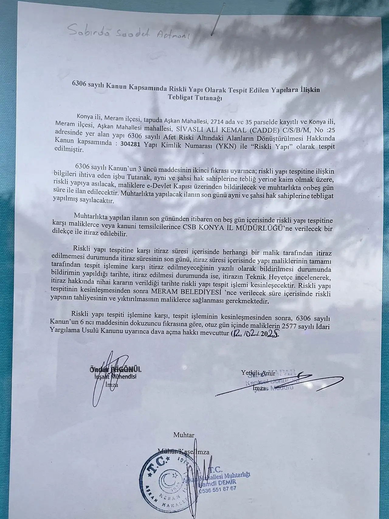 Bina sakinlerinin 15 gün dolunca riskli yapı tespitine karşı itiraz edebilecekleri hatırlatıldı. Riskli yapı tespitine karşı itiraz edilmemesi durumunda binanın Meram Belediyesi tarafından verilecek süre içerisinde tahliye edilmesinin veya yıktırılmasının hak sahipleri tarafından sağlanması gerektiği vurgulandı.