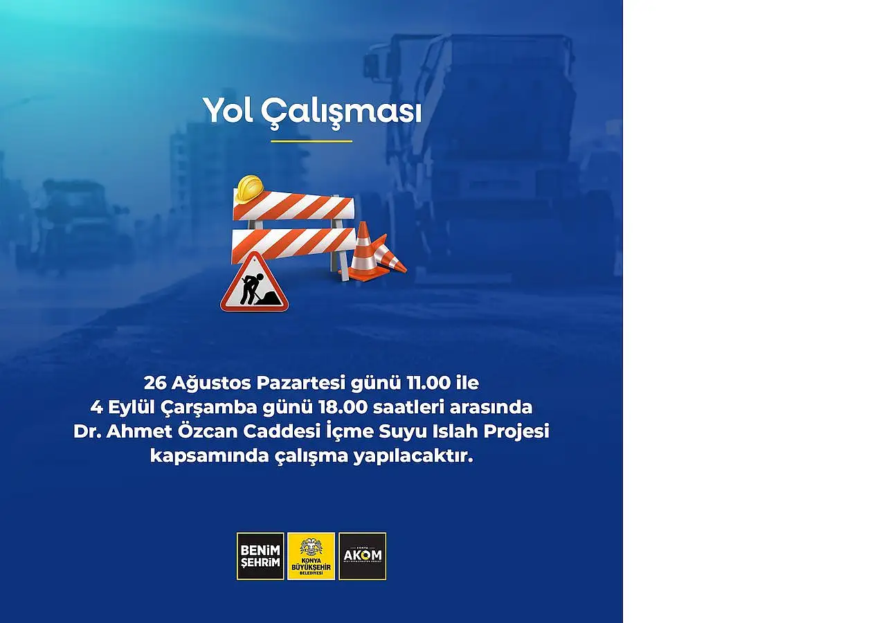 Konya Büyükşehir Belediyesi Afet Koordinasyon Merkezi (AKOM) sosyal medya hesabından yaptığı paylaşımla 26 Ağustos Pazartesi günü 11.00 ile 4 Eylül Çarşamba günü 18.00 saatleri arasında Dr. Ahmet Özcan Caddesi İçme Suyu Islah Projesi kapsamında çalışma yapılacağını ve çalışmalar esnasında Larende Caddesi ile Söğütlü Sokak arası trafiğe kapatılacağını duyurdu.