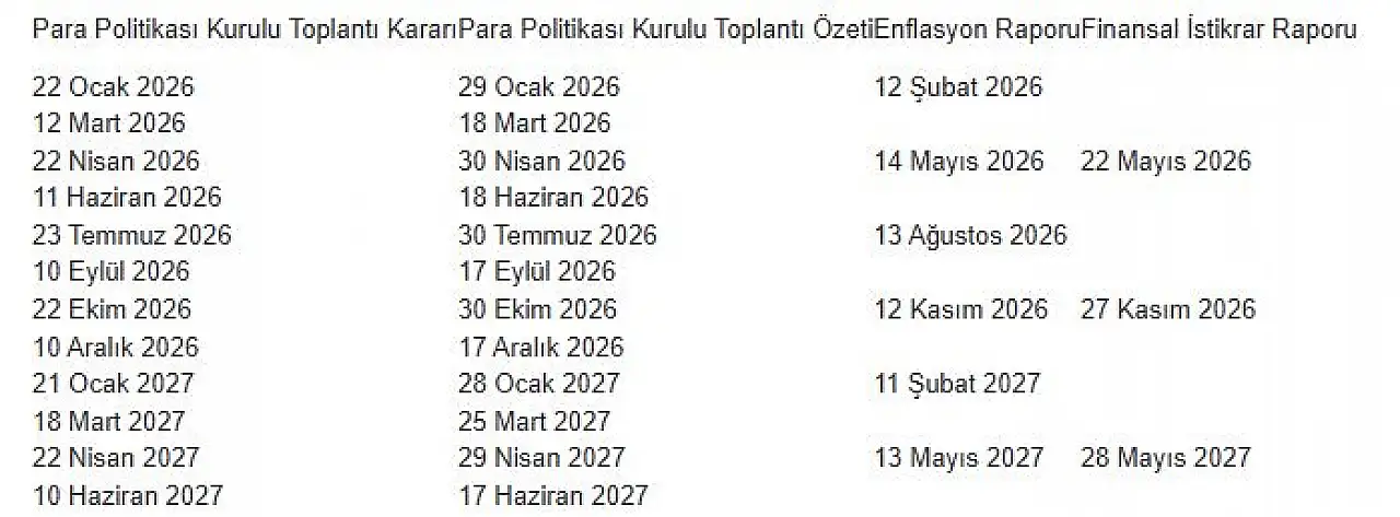 Merkez Bankasının 2026 yılına ilişkin yayımladığı takvim şöyle: