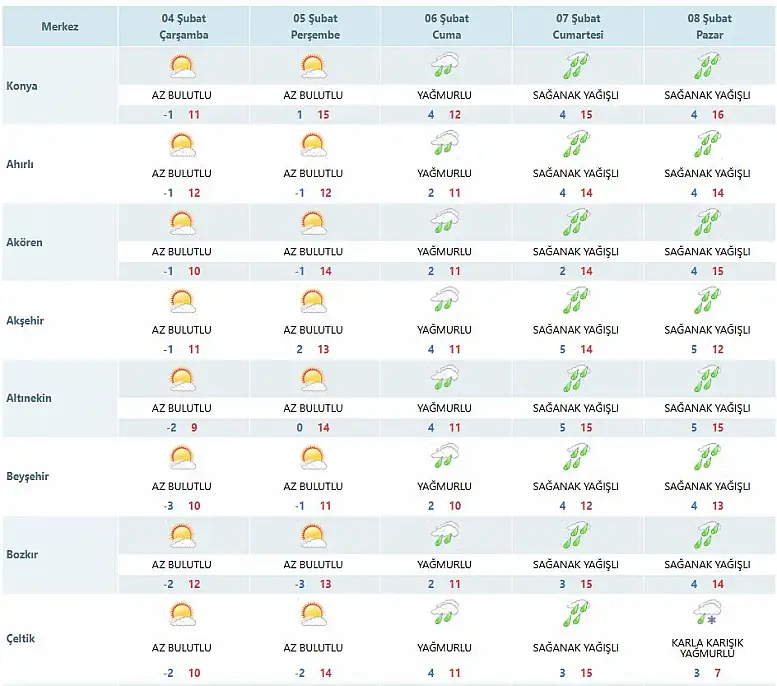 Konya'da hafta ortasında sakin seyreden hava, cuma gününden itibaren yerini yağmur ve sağanaklara bırakacak. Bazı ilçelerde ise karla karışık yağmur bekleniyor