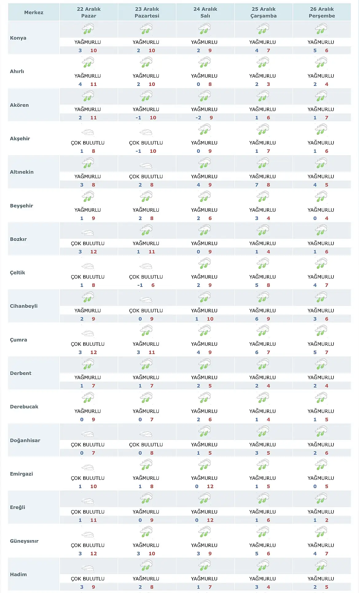 Konya’da 22 Aralık Pazar günü 10 derece ve yağışlı olacak. Konya ve ilçelerinde yağmurlu hava önümüzdeki günlerde etkisini sürdürecek.