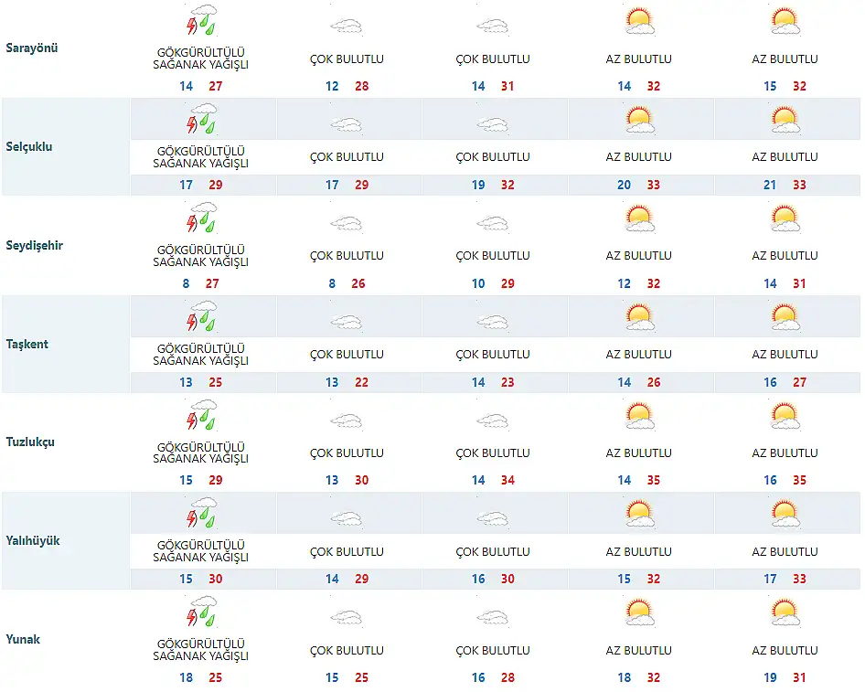 Meteoroloji 8. Bölge Müdürlüğü, tarafından yapılan son tahmine göre Konya merkez ve ilçelerinde en düşük ve en yüksek sıcaklık dereceleri ise şöyle olacak: