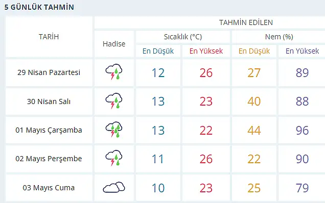 29 Nisan Pazartesi(yarın) havanın 26 derece ve gökgürültülü sağanak yağışlı olacağı belirtildi.