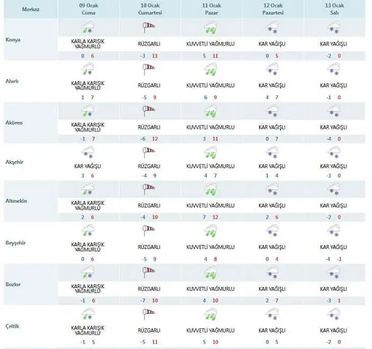 Meteoroloji Genel Müdürlüğü, Konya ve ilçelerini kapsayan 5 günlük hava durumu tahminlerini yeniledi. Dün il genelinde etkili olan ve bazı bölgelerde hasara yol açan şiddetli fırtınanın gücünü yitirmesi bekleniyor. Ancak fırtınanın ardından Konya'yı yağışlı ve soğuk bir hava dalgası karşılayacak.