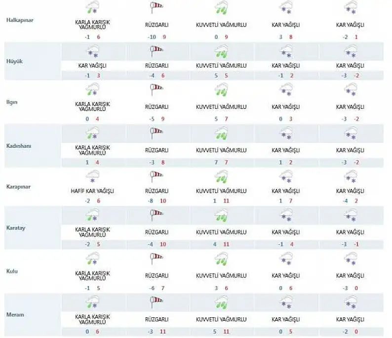 Meteoroloji Genel Müdürlüğü, Konya ve ilçelerini kapsayan 5 günlük hava durumu tahminlerini yeniledi. Dün il genelinde etkili olan ve bazı bölgelerde hasara yol açan şiddetli fırtınanın gücünü yitirmesi bekleniyor. Ancak fırtınanın ardından Konya'yı yağışlı ve soğuk bir hava dalgası karşılayacak.