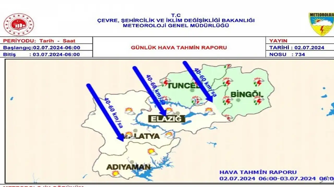 Meteoroloji 13. Bölge Müdürlüğü tarafından yapılan açıklamada, "Bölge genelinde havanın parçalı ve çok bulutlu, öğle saatlerinden itibaren Bingöl ve Tunceli çevreleri ile Elazığ'ın doğu kesimlerinin yerel olmak üzere aralıklı sağanak ve gök gürültülü sağanak yağışlı geçeceği tahmin edilmektedir. Hava sıcaklıklarının mevsim normalleri civarında seyretmesi beklenmektedir. Rüzgarların kuzeyli yönlerden orta kuvvette, yer yer kuvvetli rüzgar ve kısa süreli fırtına şeklinde eseceği tahmin edilmektedir. Rüzgarların kuzeyli yönlerden orta kuvvette, yer yer kuvvetli rüzgar ve kısa süreli fırtına şeklinde esmesi beklendiğinden meydana gelebilecek olumsuzluklara karşı dikkatli ve tedbirli olunması önem arz etmektedir" denildi.