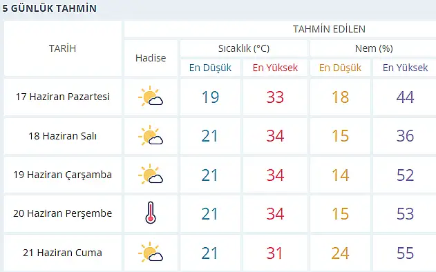 17 Haziran Pazartesi(yarın) havanın 33 derece ve az bulutlu olacağı belirtildi.