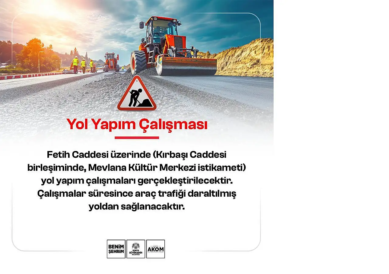 ???? Fetih Caddesi üzerinde (Kırbaşı Caddesi birleşiminde, Mevlana Kültür Merkezi istikameti) yol yapım çalışmaları gerçekleştirilecektir. Çalışmalar süresince araç trafiği daraltılmış yoldan sağlanacaktır.