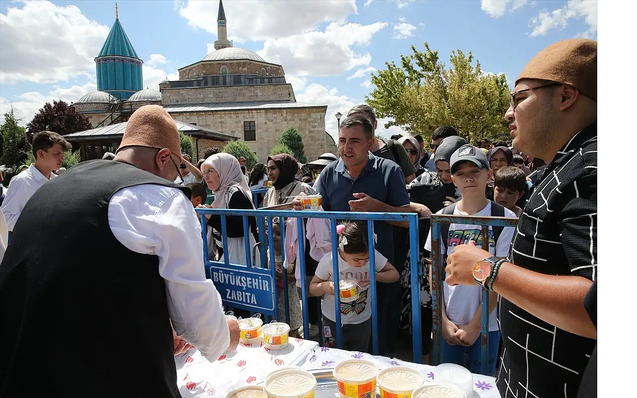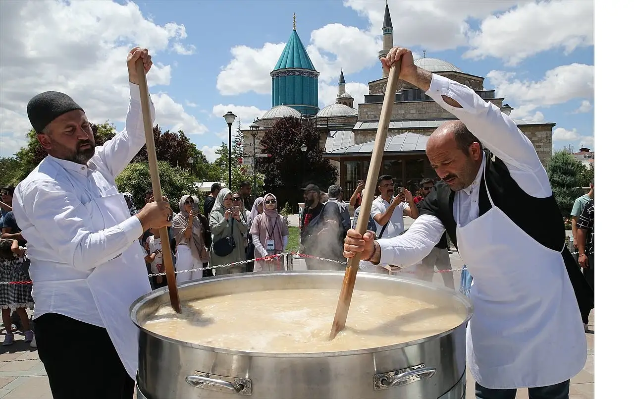 Mevlana Türbesi avlusunda düzenlenen 'Huzur-ı Pirde Aşure' etkinliği kapsamında, sabahtan itibaren kazanlarda aşure kaynatılmaya başlandı.İlahiler eşliğinde karıştırılan 6 kazan aşure, Mevlid-i Şerif ve zikirlerle öğle saatlerine kadar pişirildi.