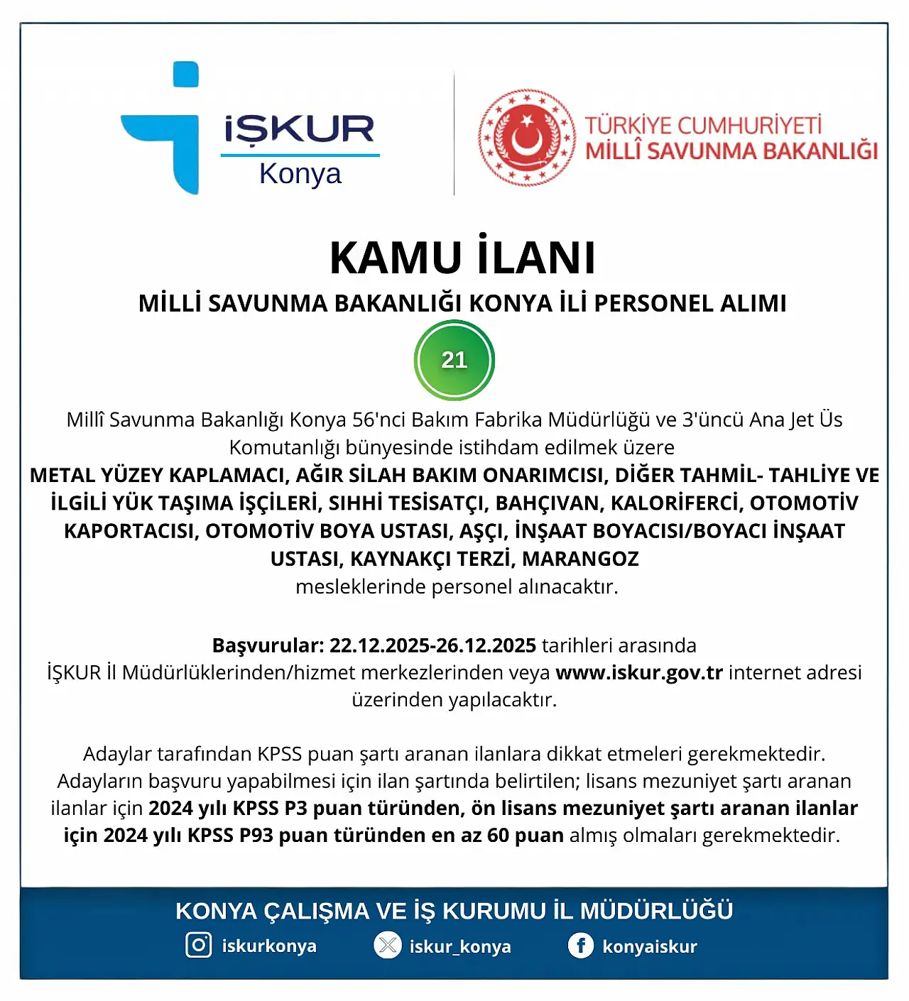 Millî Savunma Bakanlığı (MSB), Konya’daki 56'ncı Bakım Fabrika Müdürlüğü ve 3'üncü Ana Jet Üs Komutanlığı bünyesinde istihdam edilmek üzere farklı meslek dallarında sürekli işçi alımı yapacağını duyurdu. İŞKUR üzerinden yayımlanan ilana göre metal yüzey kaplamacıdan ağır silah bakım onarımcısına, aşçıdan marangoza kadar geniş bir yelpazede personel alımı gerçekleştirilecek. Başvurular 22-26 Aralık 2025 tarihleri arasında İŞKUR internet sitesi veya hizmet merkezleri aracılığıyla yapılabilecek. Adayların 18 yaşını tamamlamış ve 36 yaşından gün almamış olması gerekirken; ön lisans ve lisans mezuniyeti şartı aranan kadrolar için 2024 KPSS sınavından en az 60 puan almış olma şartı aranıyor.