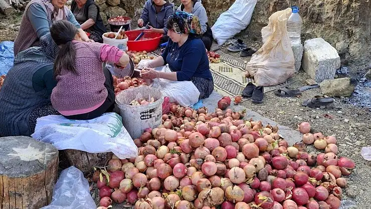 Feke'de üretici Hasan Gezer tarafından kurulan bahçede hasat edilen ve narların ekşi olma yolculuğu başladı. Sopalarla dövülerek kabuğundan tanelere ayrılan nar zorlu süreçlerden geçilerek ekşi oluyor.
