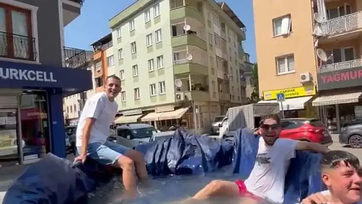 Bursa'da sıcak havalardan bunalan bir grup genç, traktörün römorkunu suyla doldurup mobil havuza çevirdi.Şehir turu atan gençler sıcak havaların tadını doyasıya çıkardılar.