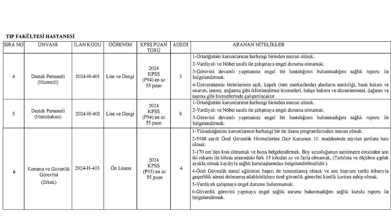 Destek personeli (Hizmetli) 3 kişi, destek personeli (Hastabakıcı) 8 kişi, koruma ve güvenlik görevlisi (erkek) 4 kişi alınacak.
