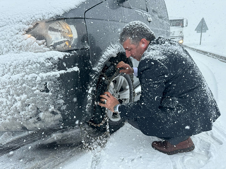 Van-Hakkari kara yolunun Güzeldere Tüneli yakınlarında kar nedeniyle bazı araçlar yolda kaldı. İlerlemekte güçlük çeken sürücüler araçlarına zincir taktı, tır sürücüleri yolların temizlenmesini bekledi.
