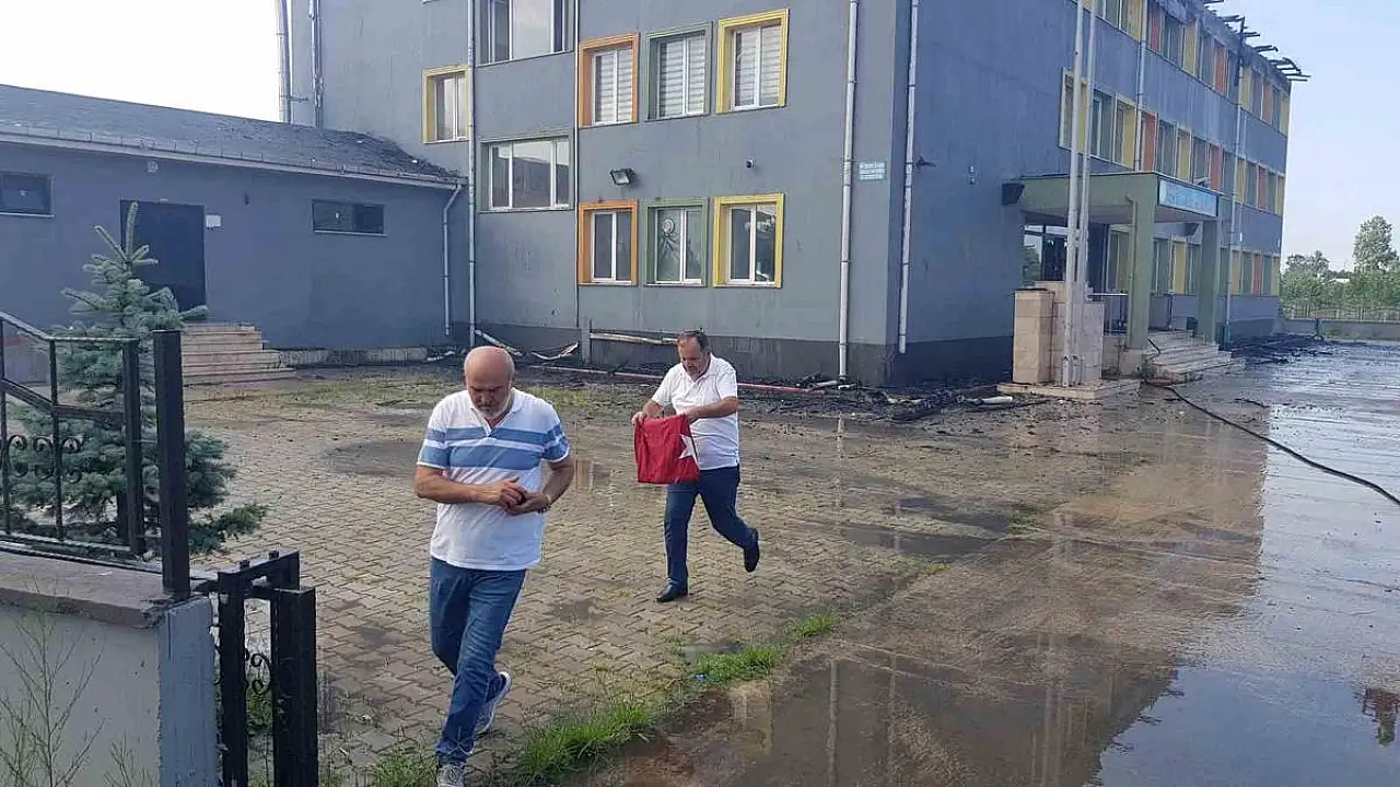 Samsun'da bir okulun çatısı çıkan yangında alevlere teslim oldu. Olay yerindeki polis, yanma tehlikesi bulunan Türk bayrağını alarak güvenli alana götürdü.