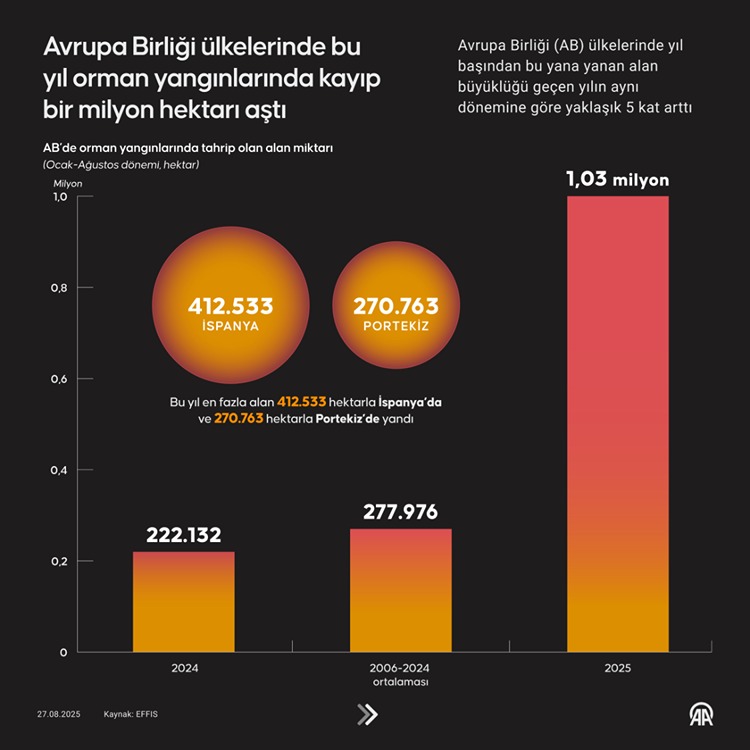 AB ülkelerinde bu yıl çıkan yangınlarda, 26 Ağustos itibarıyla yanan alan büyüklüğü 1 milyon 25 bin 36 hektara ulaştı. Yaklaşık 10 bin 230 kilometrekare olan bu alan, neredeyse İstanbul'un iki katı büyüklüğünde yüzölçümüne karşılık geliyor.